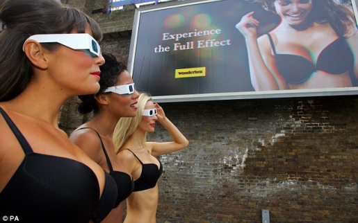 Wonderbra burst on the international scene in the UK with a brilliant advertisement featuring Eva Herzigova wearing the cleavage-enhancing brassiere, alongside the phrase, “Hello, Boys!”  The ad, one of the most famous in history, was something of a controversy when it first debuted thanks to the distracting effect of an underwear-clad supermodel some 30 feet high.  Now, in an attempt to top that, Wonderbra’s new billboard for its Full Effect bra is in 3D.